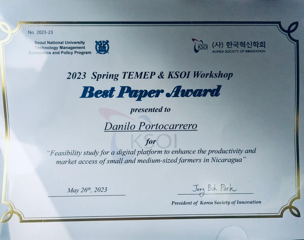 El proyecto “Estudio de factibilidad de una plataforma digital para mejorar la productividad y el acceso al mercado de pequeños y medianos agricultores en Nicaragua”, fue premiado con el Best Paper Award, que entrega el presidente de la Sociedad Coreana de Innovación de la Universidad de Seúl, Jong Bok Park.
