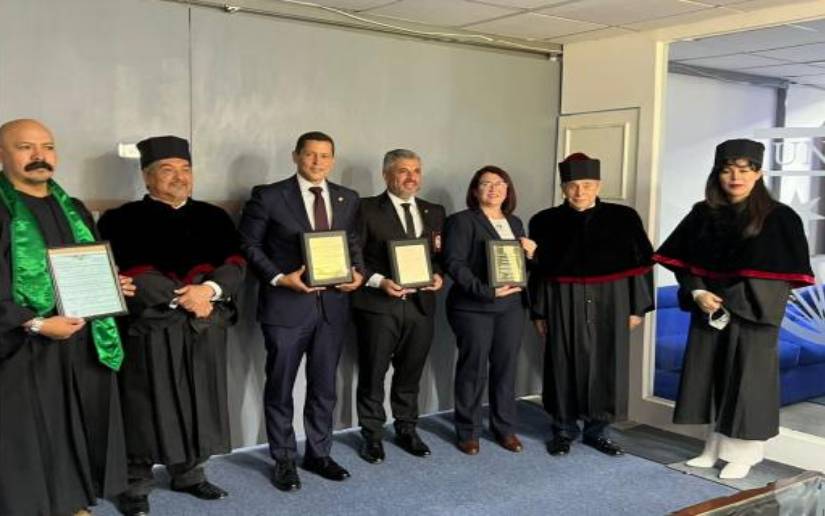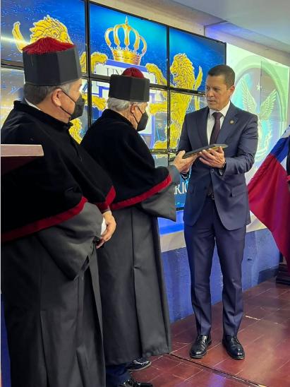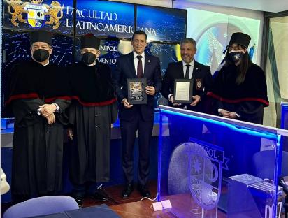 Othón Pérez Fernández del Castillo, Rector de la UNIPOL entregó a Carlos Gutiérrez Madrigal, la Presea Zafiro, quien la recibió en nombre del gobierno de Nicaragua y agradeció tan importante reconocimiento.