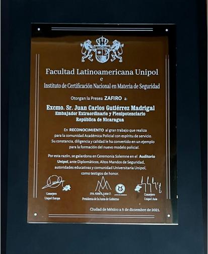 La Facultad Latinoamericana de la Universidad Nacional Policial A.C. (UNIPOL) a través de la embajada de Nicaragua en México, entregó al gobierno presidido por el Comandante Daniel Ortega Saavedra, Presidente de la República y la Compañera Vicepresidenta Rosario Murillo Zambrana, la Presea Zafiro, que tiene como objetivo reconocer las mejores prácticas para la profesionalización policial.