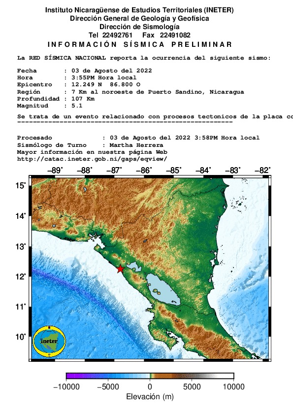 El movimiento telúrico se registró a 108 kilómetros de profundidad, a 8 kilómetros al norte de Puerto Sandino en tierra firme y fue sentido fuerte en el sector de occidente