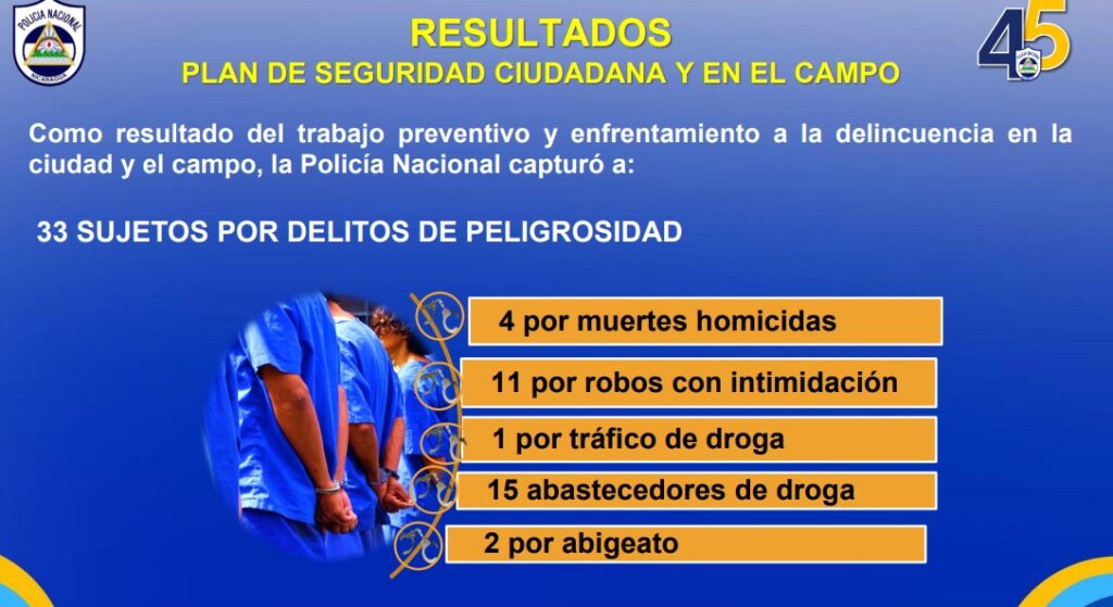 Del 27 de junio al 03 de julio, 33 personas fueron detenidas señaladas de cometer diversos delitos, entre estos, 15 abastecedores de droga, 4 homicidas, y 11 por robo con intimidación o asalto, informó este jueves el Inspector General de la Policía Nacional, Jaime Vanegas.