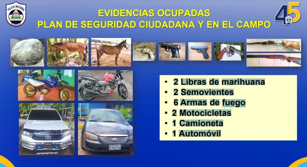 El funcionario detalló que dentro de las evidencias ocupadas se destacan: 2 Libras de marihuana, 2 Semovientes, 6 Armas de fuego, 2 Motocicletas, 1 Camioneta y 1 Automóvil.