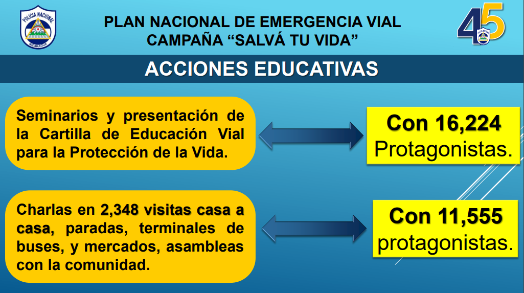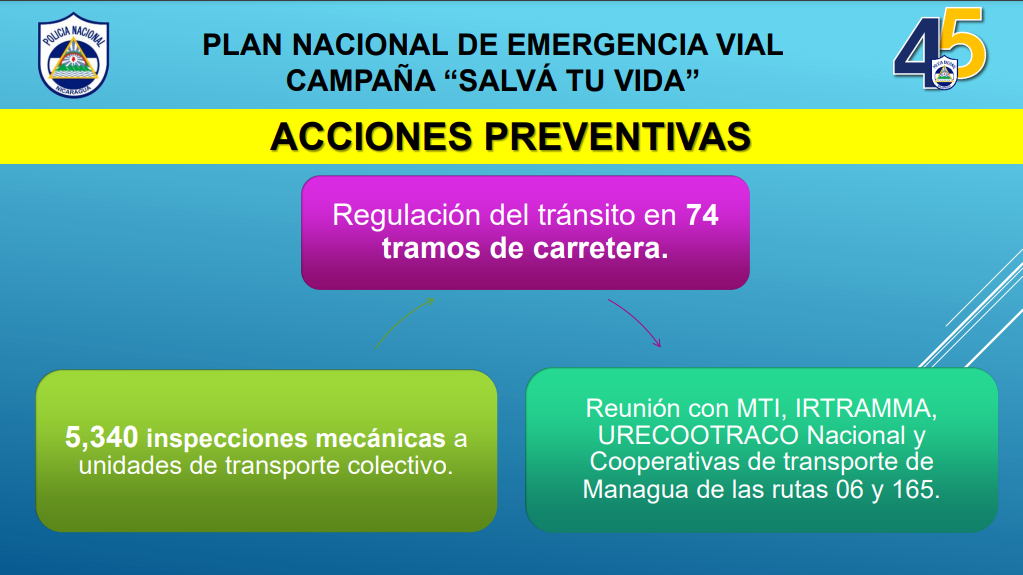 Por otra parte, los agentes de la Dirección de Tránsito Nacional realizaron 5 mil 340 inspecciones mecánicas a unidades de transporte colectivo y presentaron la Cartilla de Educación Vial para la Protección de la Vida a 16 mil 224 protagonistas.
