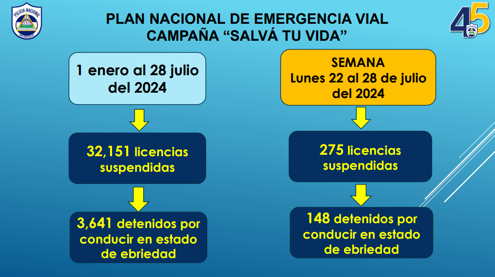 En relación a la semana del 22 al 28 de julio, se requisaron 2 mil 591 vehículos y mil 200 pruebas de alcoholemia.