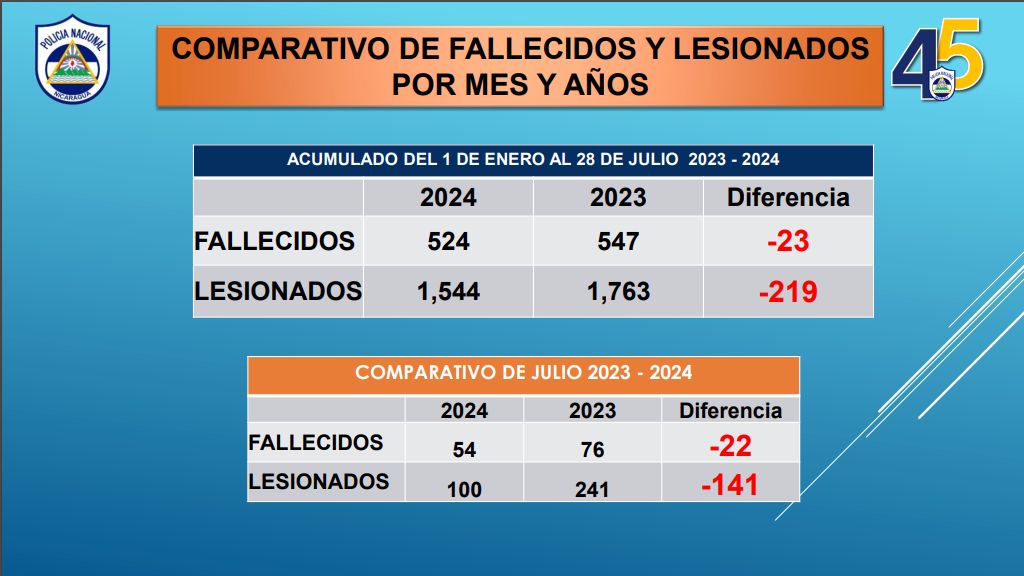 El Inspector General de la Policía Nacional, comisionado general Jaime Vanegas, informó este martes que la Dirección de Seguridad de Tránsito en lo que va del año 2024 registra 524 personas fallecidas y mil 544 lesionadas en accidentes viales, con un descenso de 23 muertes y una baja de 219 lesionado en relación al mismo período del año 2023.