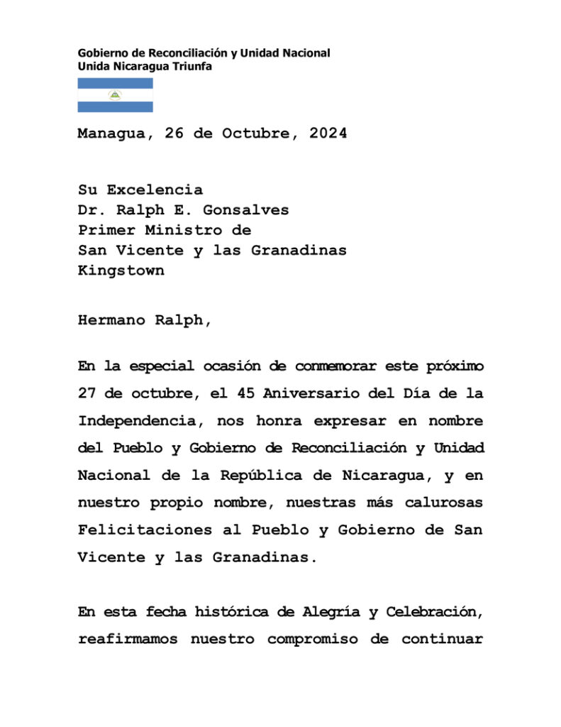 Mensaje de saludos y felicitaciones del Presidente Comandante Daniel Ortega y la Vicepresidenta Compañera Rosario Murillo, a su Excelencia, Doctor Ralph E. Gonsalves, Primer Ministro de San Vicente y las Granadinas, al conmemorarse el 45 Aniversario del Día de la Independencia en ese hermano país.