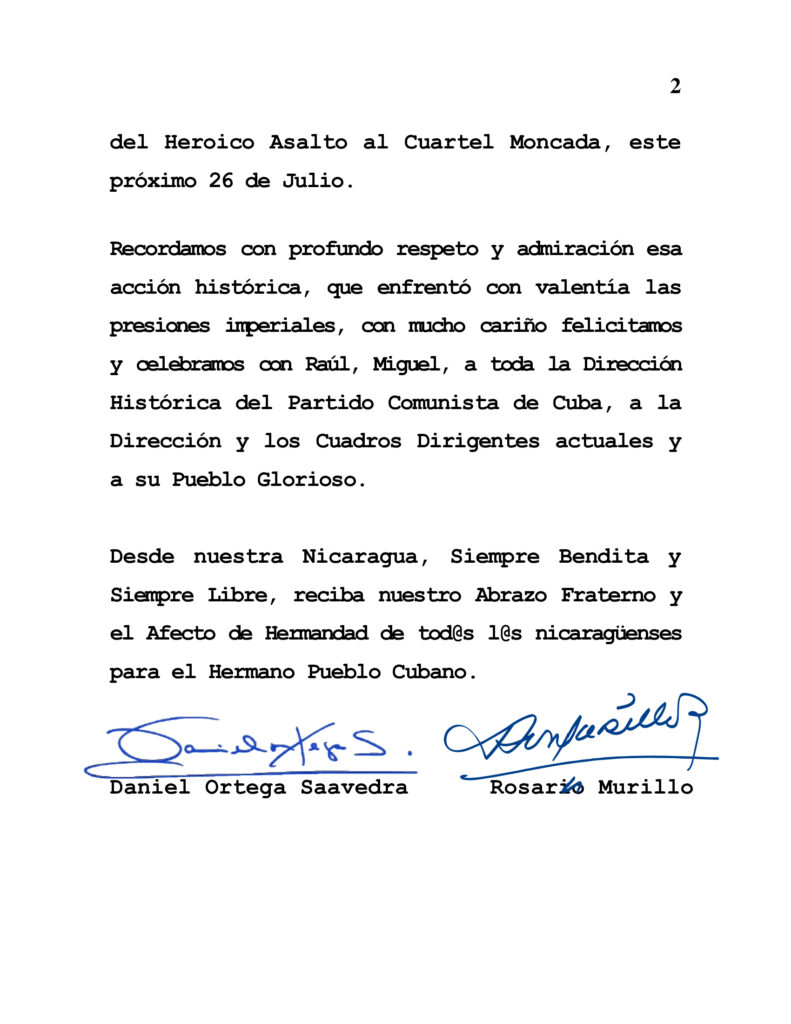 El Gobierno Sandinista envió este viernes un mensaje de felicitaciones al pueblo y gobierno de Cuba, al celebrar este próximo sábado el 72 aniversario del asalto al cuartes moncada: