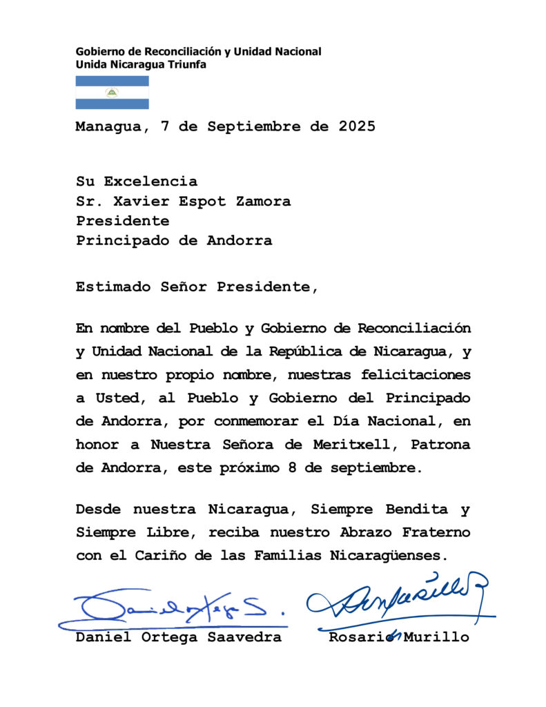 En ocasión de celebrarse este 8 de septiembre el Día Nacional de Andorra, el Gobierno Sandinista envió un saludo al pueblo y al Presidente de dicha nación.