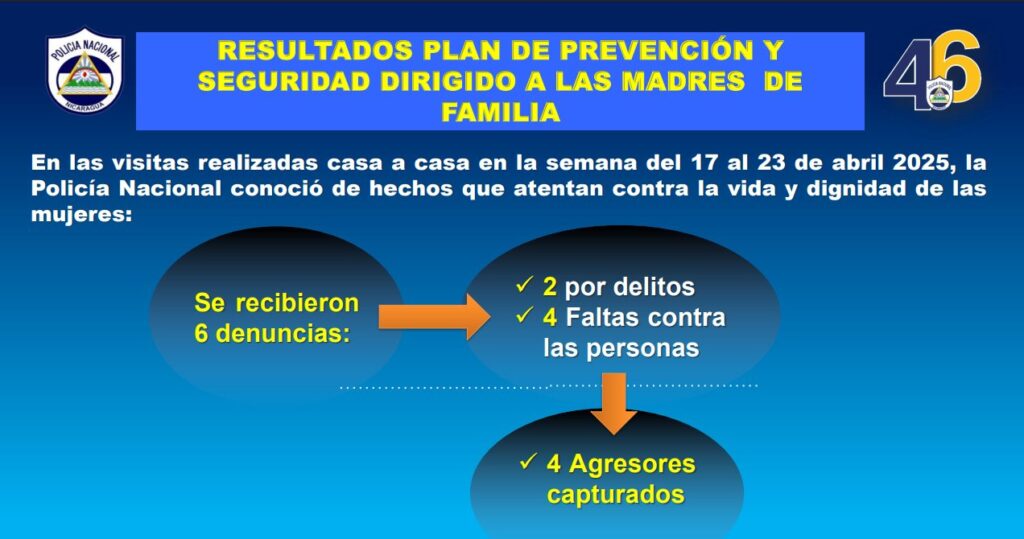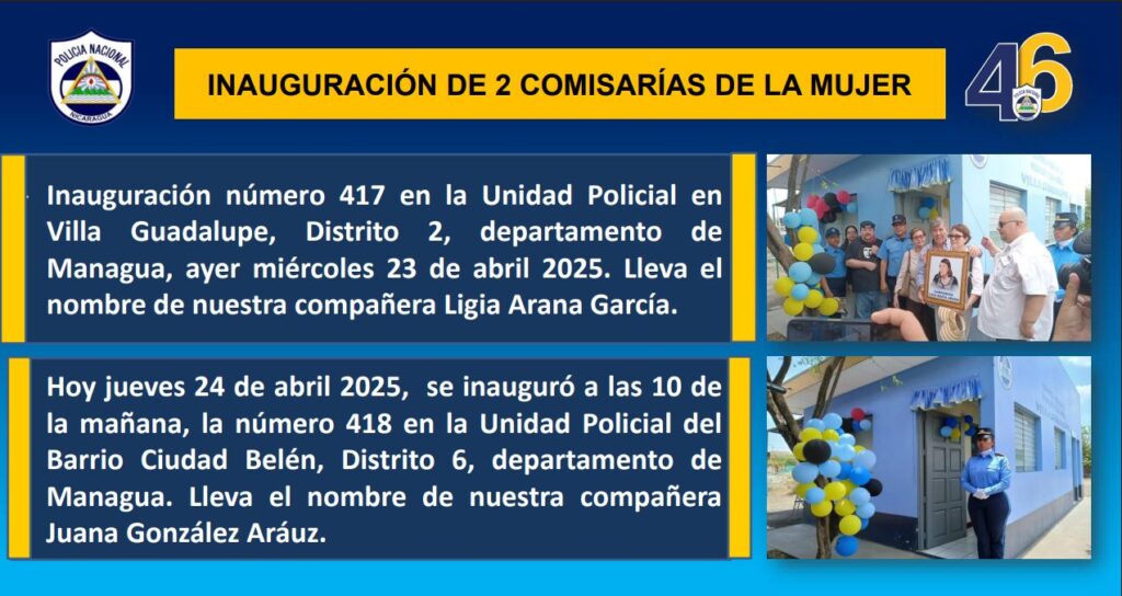 “En esta semana dos comisarías han sido inauguradas. La inauguración de la número 417 en la unidad policial en Villa Guadalupe, Distrito II, departamento de Managua ayer miércoles 23 de abril del 2025, lleva el nombre de nuestra compañera Ligia Arana García. Hoy jueves 24 de abril del 2025 se inauguró a las 10 de la mañana, la número 418 en la unidad policial del barrio de Ciudad Belén, Distrito VI, departamento de Managua, ella lleva el nombre de nuestra compañera Juana González Araujo”, detalló la subcomisionada Karen Obando, Cojefa de Relaciones Públicas de la Policía Nacional.