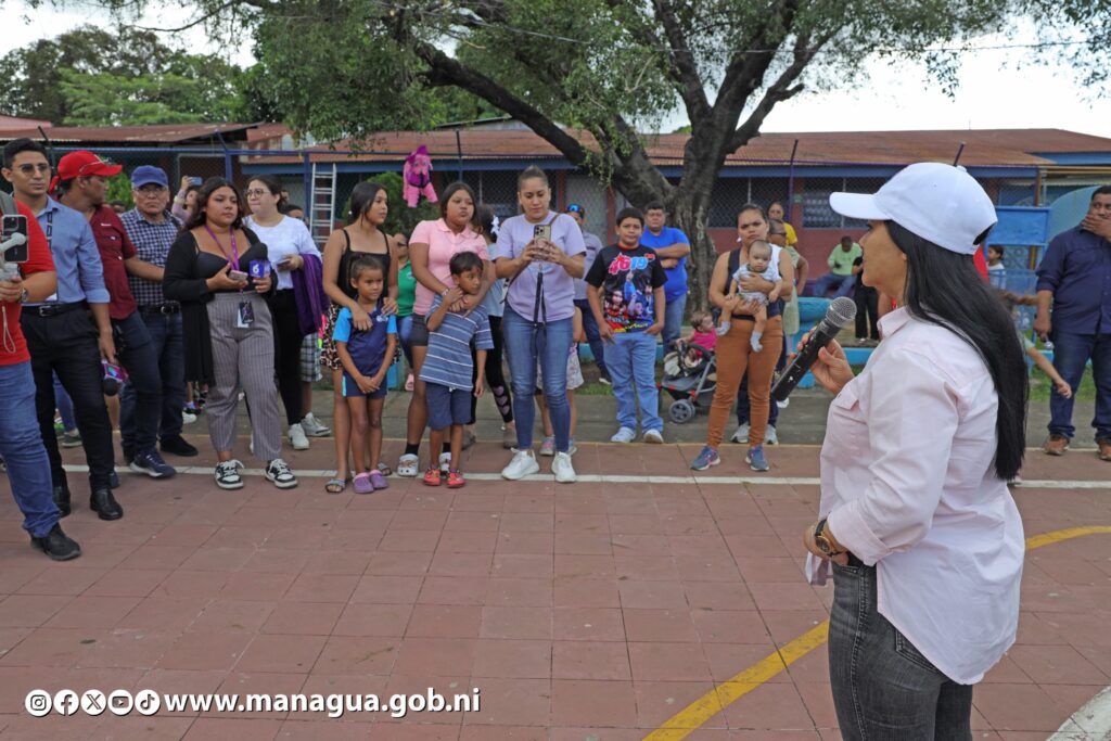 “Hoy vemos nosotros toda esa restitución de derechos, en niñas y niños en este parque. Parque que ha sido restaurado… parque que ha sido entregado a las familias de Managua, a las familias del barrio Ángel Valentino para el disfrute, para la recreación, para el deporte, para esa convivencia sana que esta Revolución entrega y restituye a las familias, a los más pequeños, a las mujeres, a las personas de la tercera edad”, manifestó la Secretaria del Concejo Municipal, Jennifer Porras.