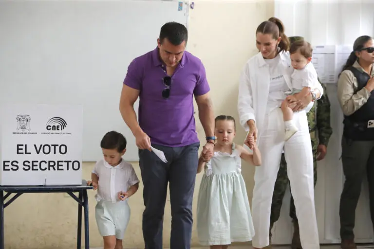 El presidente ecuatoriano Daniel Noboa ejerció su derecho al voto en la Escuela de Educación Básica “Dr. Antonio Moya”, en Olón, Santa Elena, acompañado por su esposa, Lavinia Valbonesi, y sus hijos. Durante el proceso, su hijo Álvaro mostró la papeleta con el voto de su padre, mientras que su hija Luisa lo acompañó al momento de depositar el sufragio en la urna, en pos de demostrar unidad familiar.