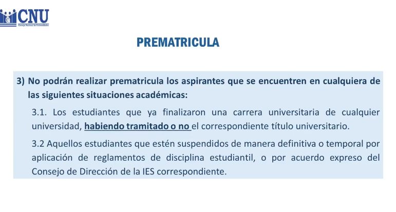 A partir del 13 de octubre inicia el proceso de prematrícula en las casas de estudios superiores públicos del país, para los más de 75 mil bachilleres que egresarán de la educación secundaria, informó este viernes la Presidenta del Consejo Nacional de Universidades (CNU), Ramona Rodríguez, durante el Lanzamiento del Sistema Único de Prematrícula y Matrícula 2025.