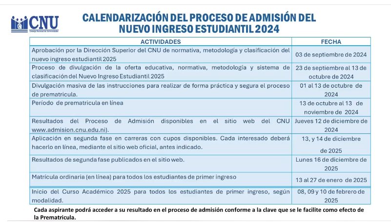 “El estudiante podrá acceder en línea al resultado de ese proceso, esto será el 12 de diciembre. El 13 y 14 de diciembre podrá acceder a los cupos disponibles que no hayan sido llenados a través del proceso ordinario. El lunes 16 diciembre, estarán ya los resultados definitivos, luego del 13 al 27 de enero del 2025 será la matrícula en línea y el inicio del curso académico está contemplado para la primera semana de febrero”, detalló por su lado, el Vicerrector de la UNAN-Managua,  Luis Alfredo Lobato.