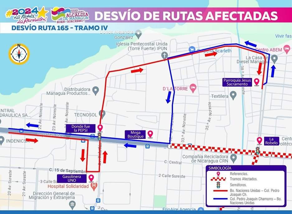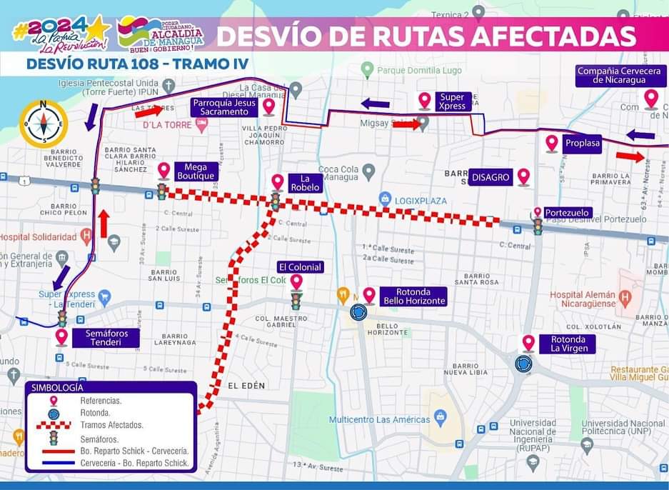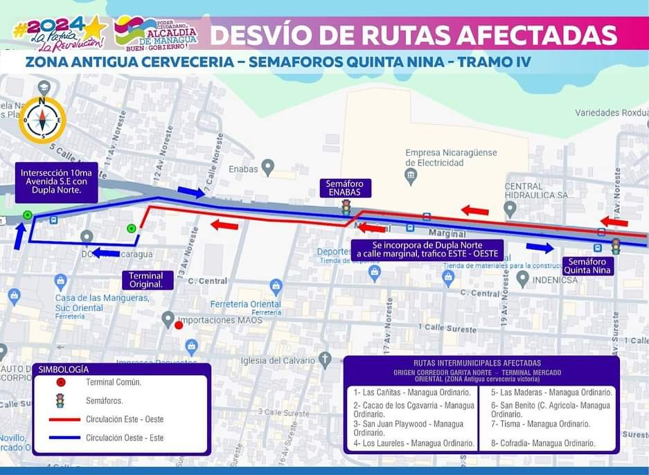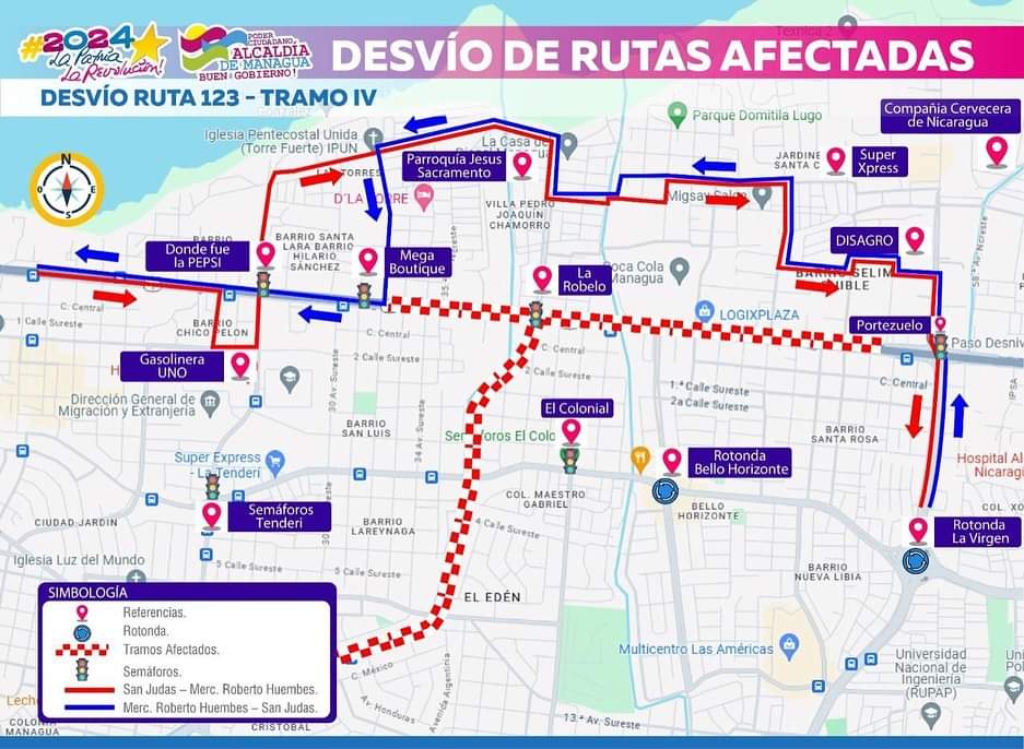 “En el caso de la ruta 123, de oeste a este dobla hacia el barrio Chico Pelón a salir a los semáforos de la Antigua Pepsi hacia el barrio Hilario Sánchez, Las Torres, Villa Pedro Joaquín Chamorro hasta salir al paso desnivel Portezuelo. De este a oeste entra por el paso desnivel Portezuelo hasta salir a la Mega Boutique”, explicó el comunicado de la municipalidad.