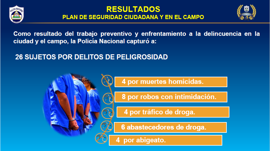 Como resultado del trabajo preventivo y enfrentamiento a la delincuencia en la ciudad y el campo, la Policía Nacional capturó a 26 sujetos por delito de peligrosidad en la semana del 29 de agosto al 4 de septiembre, entre los cuales se destacan cuatro homicidas, ocho por robo con intimidación, cuatro traficantes de droga, seis abastecedores de estupefacientes y cuatro abigeato.