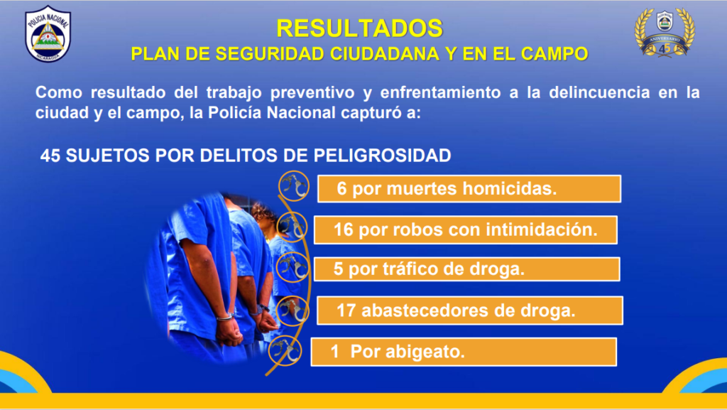 Como resultado del trabajo preventivo y enfrentamiento a la delincuencia en la ciudad y el campo, la Policía Nacional capturó a 45 sujetos por delito de peligrosidad en la semana del 15 al 21 de agosto, entre los cuales se destacan 16 asaltantes, cinco traficantes de droga, seis homicidas 17 abastecedores de drogas y un abigeato.