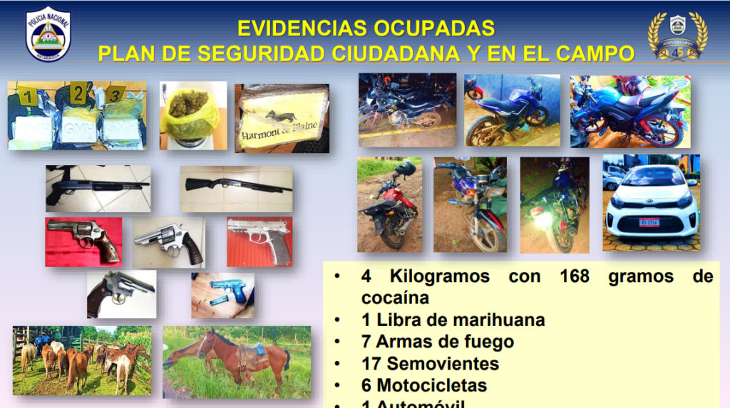 De acuerdo a las autoridades policiales, a estos delincuentes se les ocupó cuatro kilogramos con 168 gramos de cocaína, una libra de marihuana, siete armas de fuego, 17 semovientes, seis motocicletas y un automóvil.