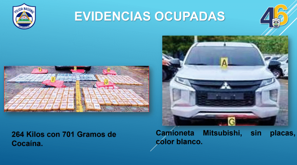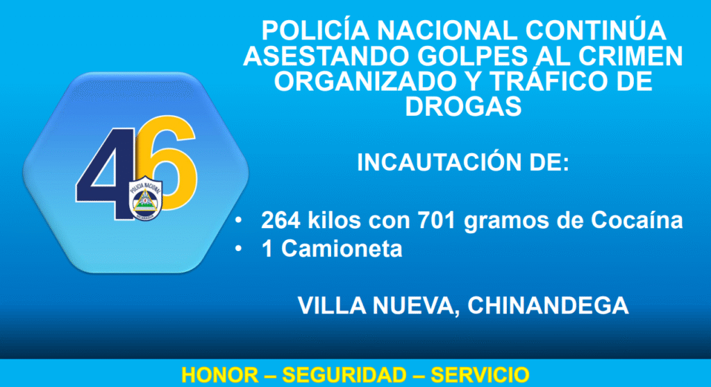 “El día miércoles 17 de septiembre a las 5:30 de la mañana en la entrada a la comunidad El Marimbero, municipio de Villa Nueva, departamento de Chinandega. La Policía Nacional en retén policial perfiló la camioneta marca Mitsubishi color blanco, sin placas. Durante la inspección realizada se localizaron cinco sacos color rojo en la tina conteniendo 237 paquetes rectangulares envueltos con cinta adhesiva, conteniendo polvo color blanco. La prueba de campo realizada dio positivo a cocaína con un peso de 264 kilos con 701 gramos”, detalló este lunes la Cojefa de Relaciones Públicas de la institución del orden público, subcomisionada Karen Obando.