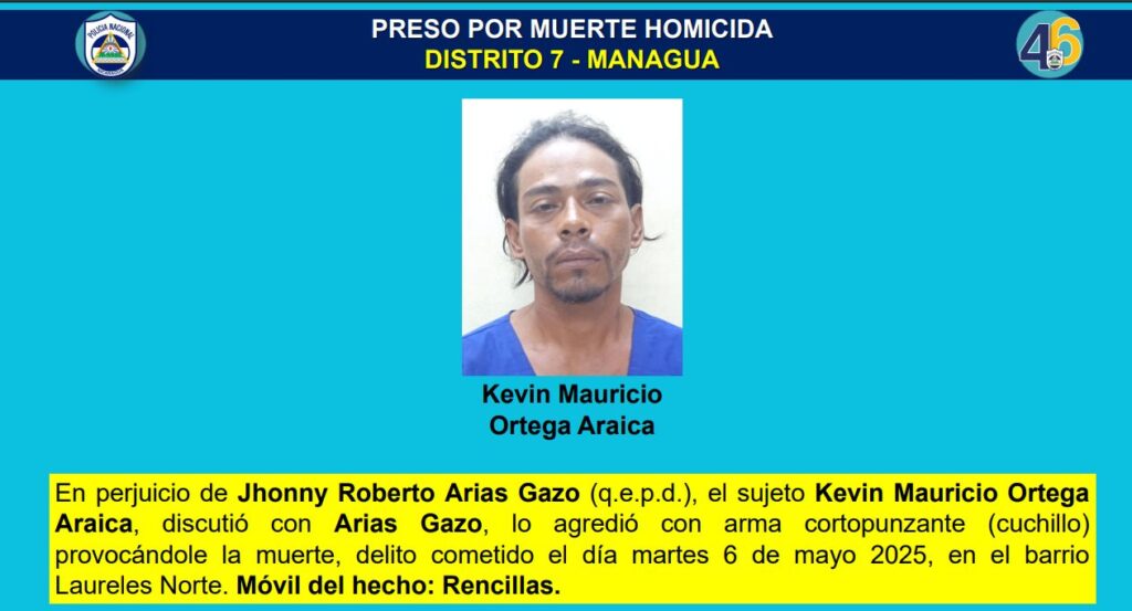 “Preso por muerte homicida, Félix Pedro Baltodano Rodríguez en perjuicio de José Antonio Sánchez Obando. El sujeto Félix Pedro Baltodano Rodríguez discutió con Sánchez Obando, lo agredió con machete, delito cometido en la comarca El Triunfo, municipio de Tipitapa. Preso por muerte homicida, Kevin Mauricio Ortega Araica, en perjuicio de Johnny Roberto Arias Gazo. El sujeto, Kevin Mauricio Ortega Araica, discutió con Arias Gazo, lo agredió con cuchillo, delito cometido el barrio Laureles Norte”, detalló la Cojefa de Relaciones Públicas de la institución del orden público, subcomisionada Karen Obando.