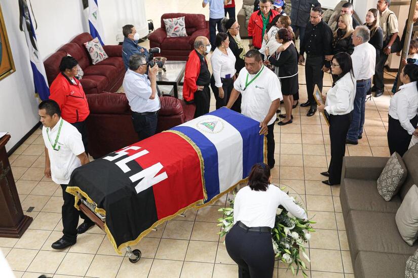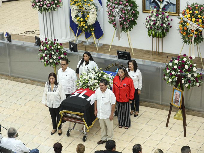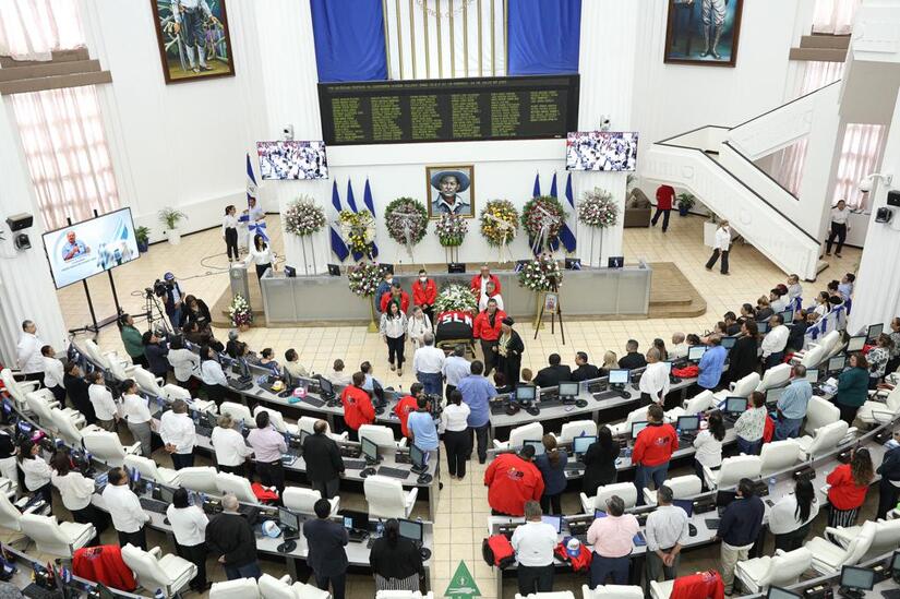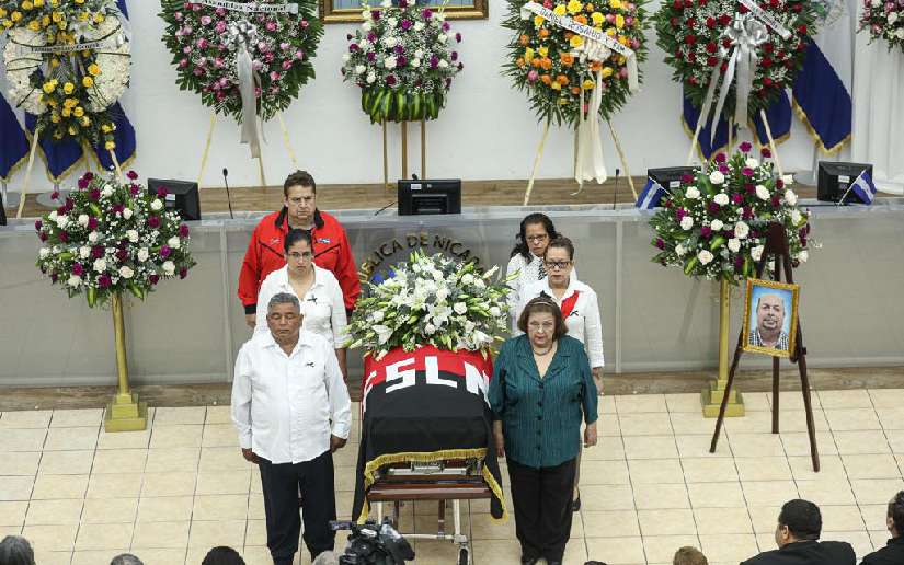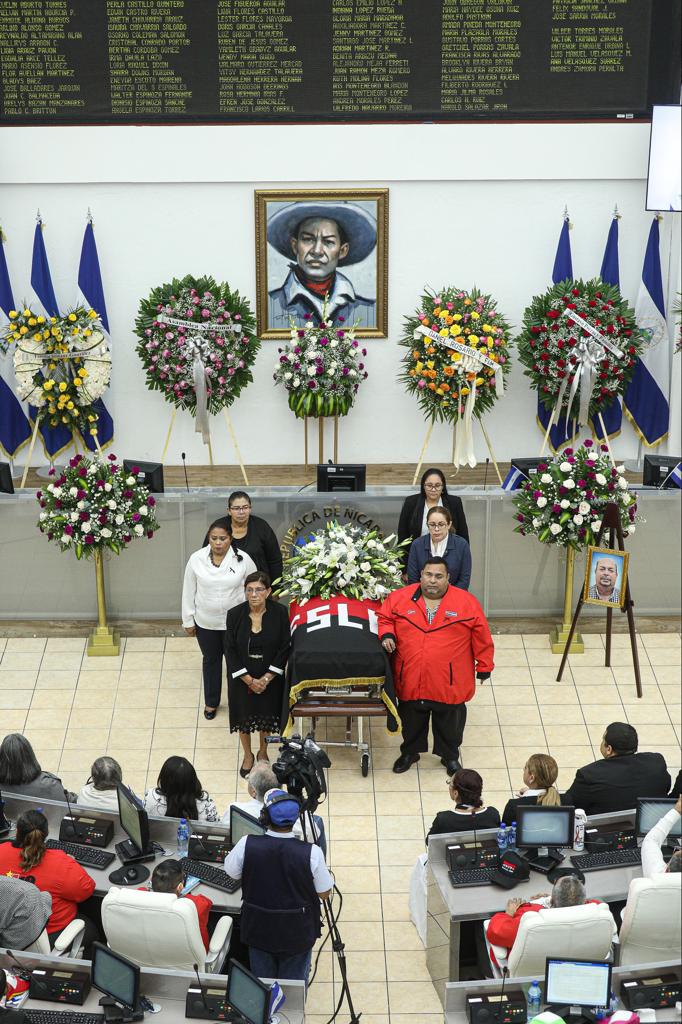 Mientras tanto, el presidente de la Asamblea Nacional, Gustavo Porras, hizo entrega de la bandera de Nicaragua y del FSLN a su esposa e hijos, además destacó el trabajo parlamentario que realizó.