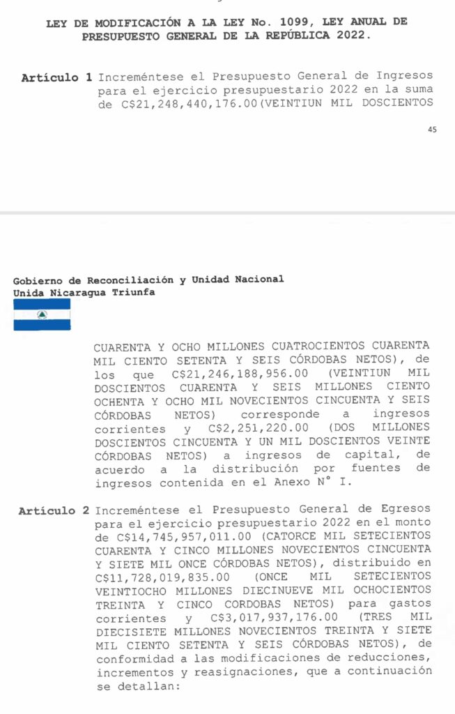 Asimismo se autoriza incrementar el presupuesto general de egresos 2022, con 14,745.9 millones de córdobas, de los cuáles 11,728 millones de córdobas serán destinados para gastos corrientes y 3,017.9 millones de córdobas en otras modificaciones.