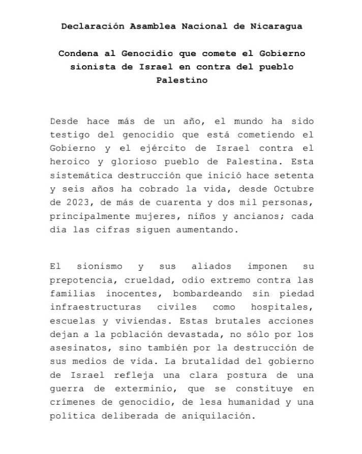 La Asamblea Nacional pidió al Gobierno de Nicaragua que “valore la ruptura de las relaciones diplomáticas con el gobierno genocida y sionista de Benjamín Netanyahu, el exhorto fue anunciado por el Presidente del Parlamento, Gustavo Porras, luego que los legisladores aprobaran por unanimidad, una condena por el genocidio que el gobierno de Israel perpetra contra el pueblo de Palestina.