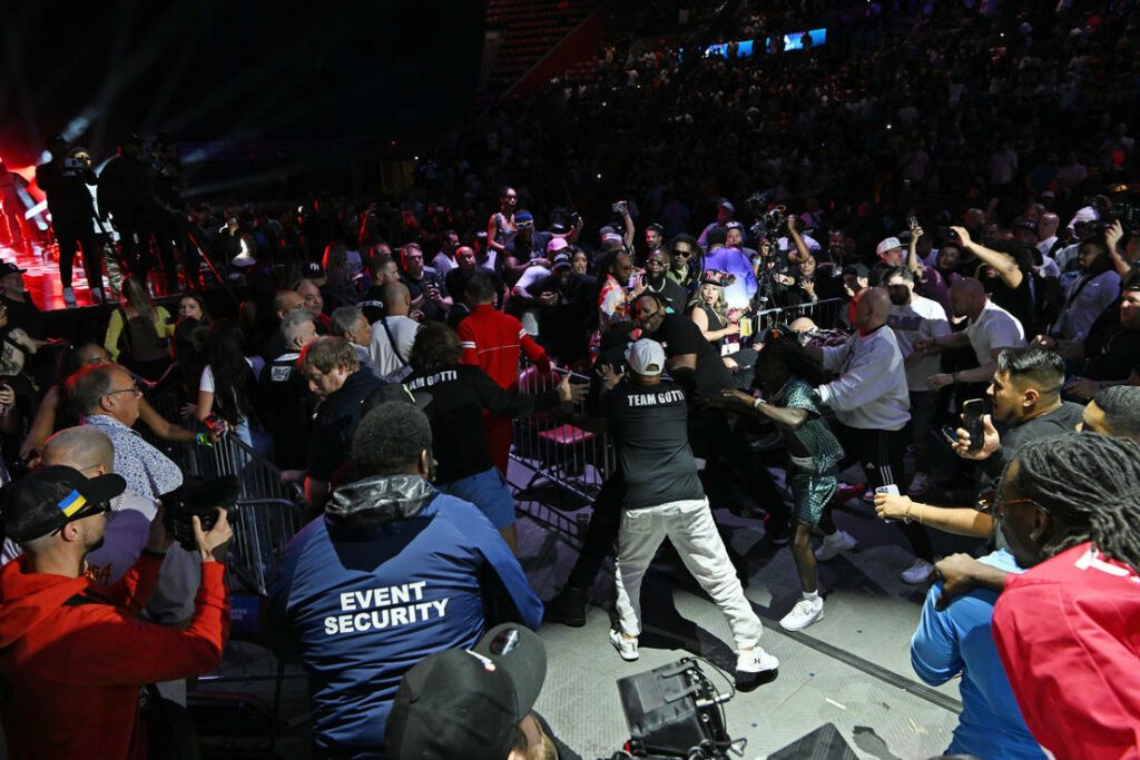 It is CHAOS right now, as there’s a brawl in the ring while Mayweather runs to the back. Fights everywhere. #MayweatherGotti @sn_fights pic.twitter.com/giNK1BLjer