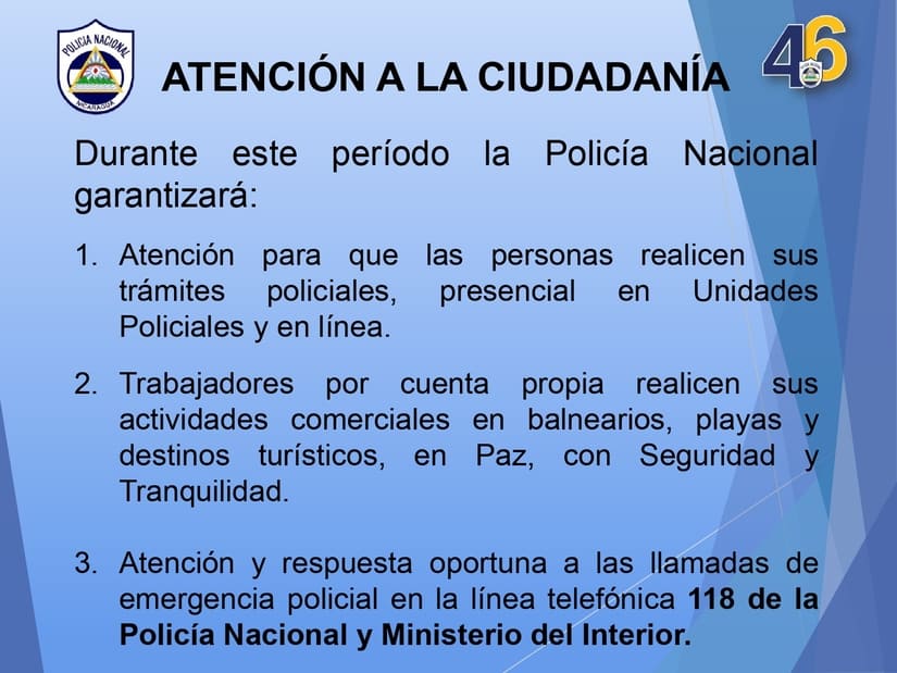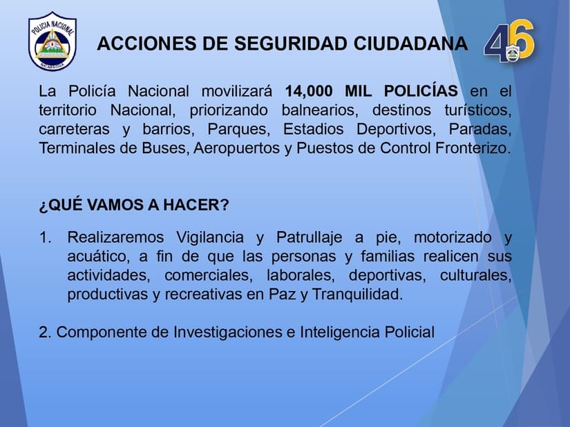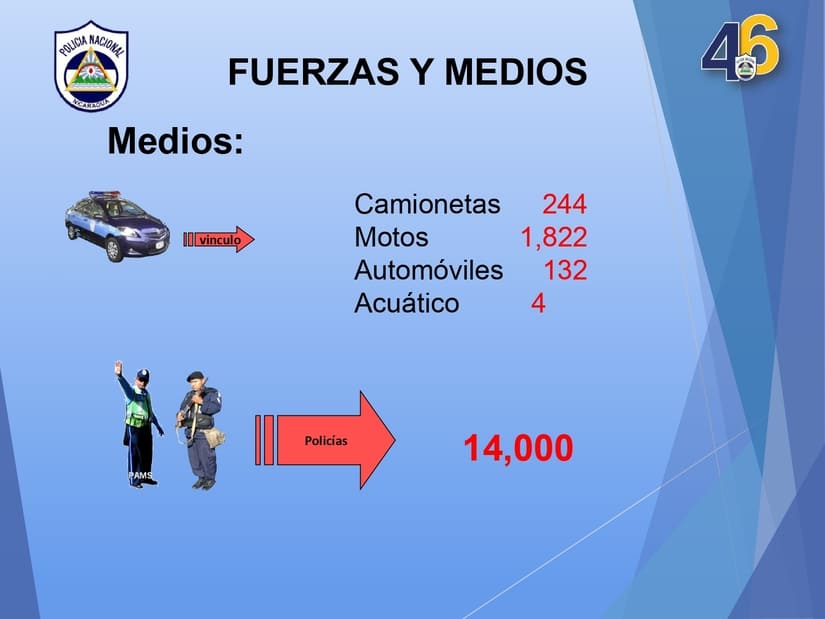 El informe detalla que se emplearán 244 camionetas, mil 822 motos, 132 automóviles y cuatro medios acuáticos; teniendo presencia en 526 balnearios, de los cuales, 12 son en el departamento de Managua; y 112 destinos turísticos, de estos, seis están en Managua.