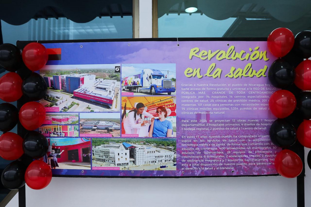 Las vallas ubicadas en el pasillo del edificio de comisiones del Complejo Legislativo Carlos Núñez Téllez, resaltan los avances en salud, educación y deportes, en la primera y segunda etapa de la revolución.