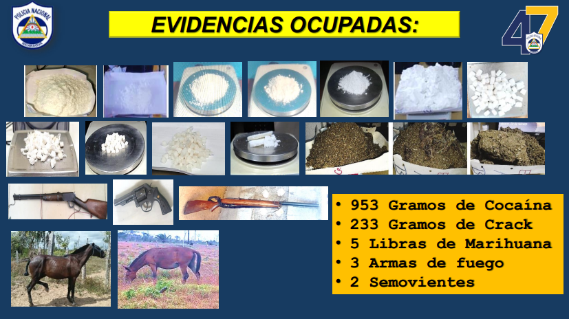 La Cojefa de Relaciones Públicas de la Policía Nacional, comisionada Karen Obando, detalló, que como resultado de los operativos, se ocuparon 953 gramos de cocaína, 233 gramos de crack, cinco libras de marihuana, tres armas de fuego y dos semovientes vinculados a los delitos investigados.