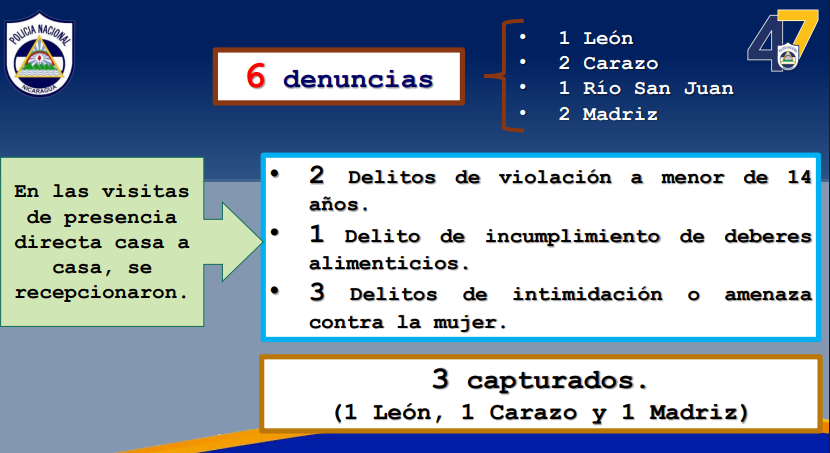 Durante estas acciones también se recibieron seis denuncias por delitos que atentan contra la integridad de mujeres y menores, logrando la captura de tres agresores en los departamentos de León, Carazo y Madriz.