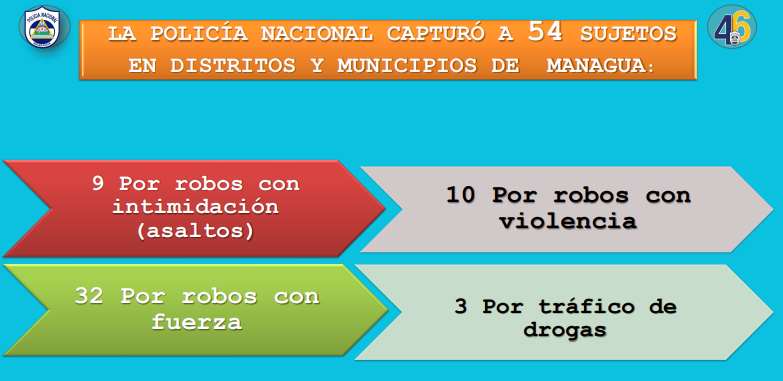 Obando, detalló que en Managua se capturaron a 32 por robo con fuerza, 10 por robo con violencia, 9 por robo con intimidación (asalto) y tres por tráfico de drogas y se les incautó de dos libras de marihuana, 115 gramos de cocaína y dinero en efectivo.