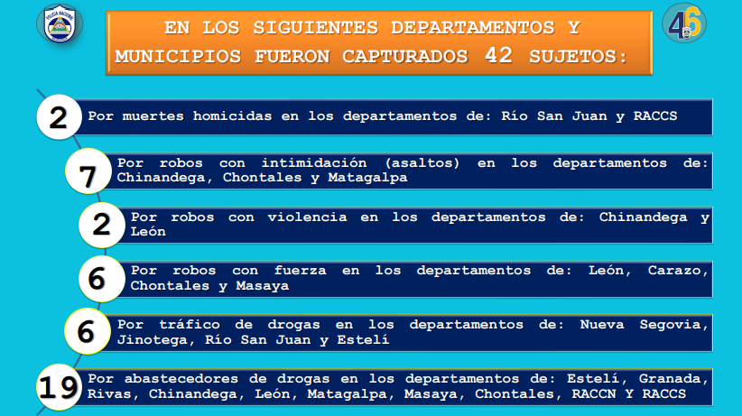 En tanto, la Cojefa manifestó que los 42 sujetos capturados son dos fueron  por muertes homicidas en Río San Juan y RACCS, siete por robos con intimidación (asaltos) en Chinandega, Chontales y Matagalpa, dos por robos con violencia en Chinandega y León.