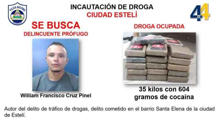 La Policía Nacional pidió este martes a la ciudadanía nicaragüense, suministrar información que permita dar con William Francisco Cruz Pinel, a quien le fueron incautados 35 kilos con 604 gramos de cocaína en el barrio Santa Elena, de Estelí.