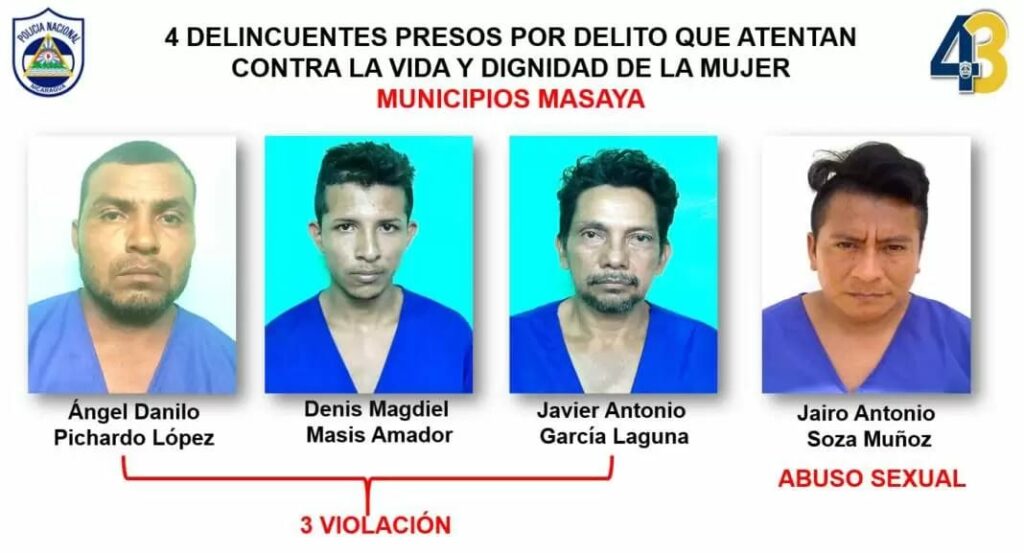 Mientras tanto, Ángel Danilo Pichardo López, Denis Magdiel Masis Amador y Javier Antonio García Laguna fueron arrestados por el delito de violación, y Jairo Antonio Soza Muñoz por abuso sexual.