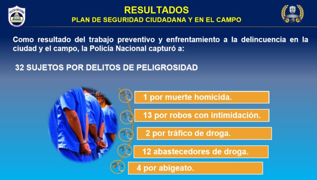 Durante la última semana la Policía Nacional detuvo a 32 sujetos acusados de cometer varios delitos en Nicaragua, entre estos, 13 por robo con intimidación, un homicida y 12 abastecedores de droga, informó este jueves el Inspector General Jaime Vanegas.