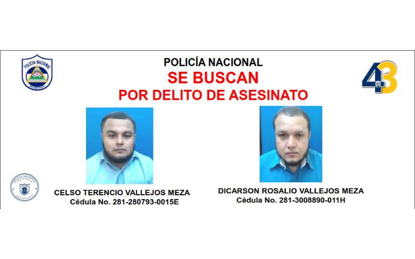 La Policía Nacional pidió a la ciudadanía nicaragüense, suministrar información que permita dar con Celso Torencio Vallejos Meza, de 29 años de edad, y Dicarson Rosalio Vallejos Meza, de 33 años de edad, ambos responsables del asesinato de una mujer, identificada como Aleyda Catalina Gómez Sandoval, delito cometido el viernes 25 de noviembre 2022, en vía pública, en barrio El Sagrario, departamento de León.