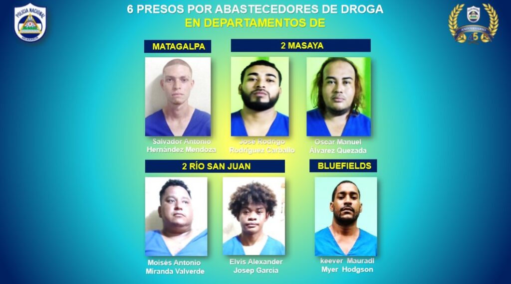 De igual forma seis abastecedores de drogas fueron detenidos en varios departamentos, uno en Matagalpa, 2 en Masaya, uno en Bluefields y 2 en Río San Juan, a estos se les ocuparon como evidencias. 265.3 gramos de cocaína, 260 gramos de crack, 908 gramos de marihuana, una pesa digital, un automóvil, una motocicleta y 3 celulares.