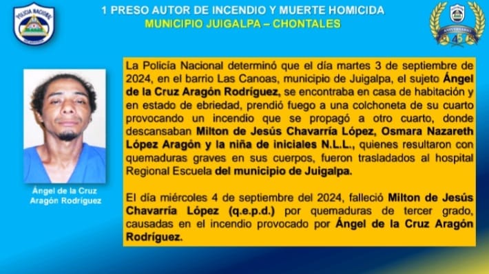 En el informe dado a conocer este lunes, se destaca el incendio y muerte homicida provocado por Ángel de la Cruz Aragón Rodríguez, el pirómano que en estado de ebriedad, el 3 de septiembre en el municipio de Juigalpa, quemó una colchoneta de su cuarto, provocando un incendio que se extendió a otro cuarto donde se encontraba una niña y Milton de Jesús Chavarría López, quienes resultaron con quemaduras.