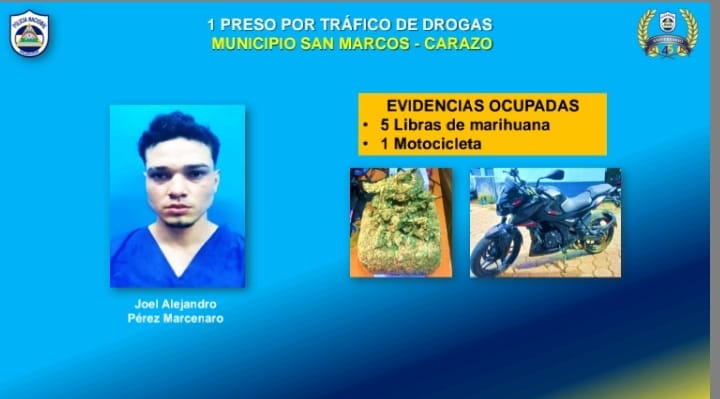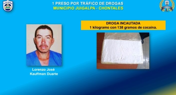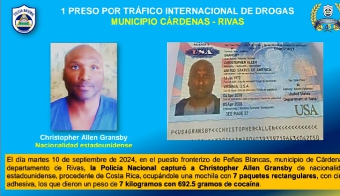 Igualmente, sobresale la detención por tráfico internacional de drogas, del sujeto Christopher Allen Gransby, de nacionalidad estadounidense, quien el 10 de septiembre al ingresar por el puesto fronterizo de Peñas Blancas, procedente de Costa Rica, se le encontró dentro de una mochila siete paquetes conteniendo 7 kilos con 692.5 gramos de cocaína.