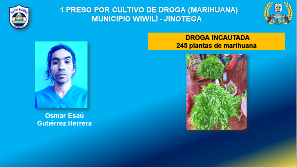 El sujeto Omar Esaú Gutiérrez Herrera fue arrestado por cultivar 245 plantas de marihuana, en el municipio de Wiwilí, en Jinotega.