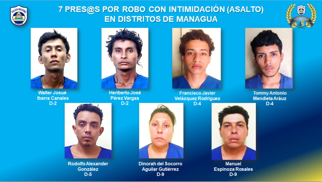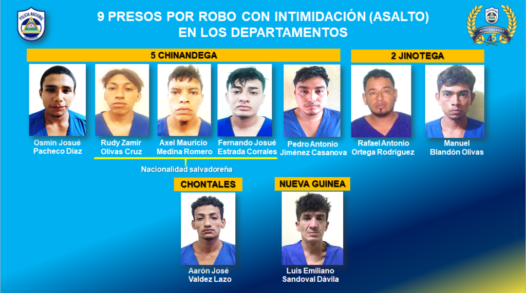 De los asaltantes cinco corresponden al municipio de Chinandega, de los cuales tres tienen nacionalidad salvadoreña; dos de Jinotega, uno de Chontales y uno de Nueva Guinea. Mientras tanto, en Managua se arrestó a dos sujetos del Distrito II, dos del Distrito IV, uno del Distrito V y uno del Distrito IX.