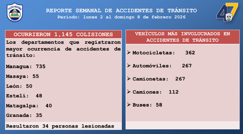 En el período del lunes 2 al domingo 8 de febrero de 2026, ocurrieron mil 145 accidentes de tránsito, informó la Cojefa de Relaciones Públicas de la Policía Nacional, comisionada Karen Obando, este martes.