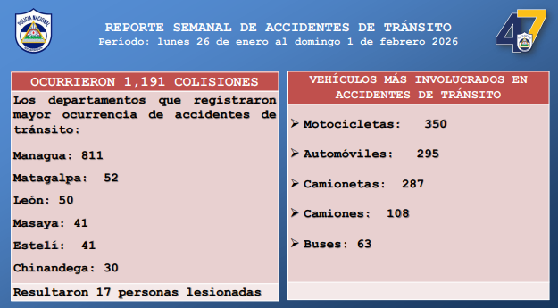 Obando detalló, que en Managua ocurrieron 811 colisiones, 52 en Matagalpa, 50 en León, 41 en Masaya, 41 en Estelí y 30 en Chinandega, donde resultaron 17 personas lesionadas.