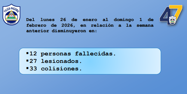 La comisionada Karen Obando señaló que se registró una disminución de 12 personas fallecidas, 27 lesionados y 33 colisiones, con respecto al mismo período de la semana anterior.