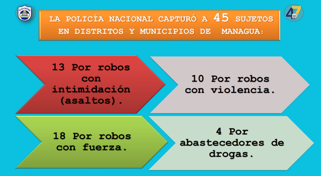La Cojefa de Relaciones Públicas, comisionada Karen Obando, detalló que de los sujetos capturados en Managua, 18 fueron por robos con fuerza, 13 por robos con intimidación, 10 por robos con violencia y 4 por abastecedores de drogas.
