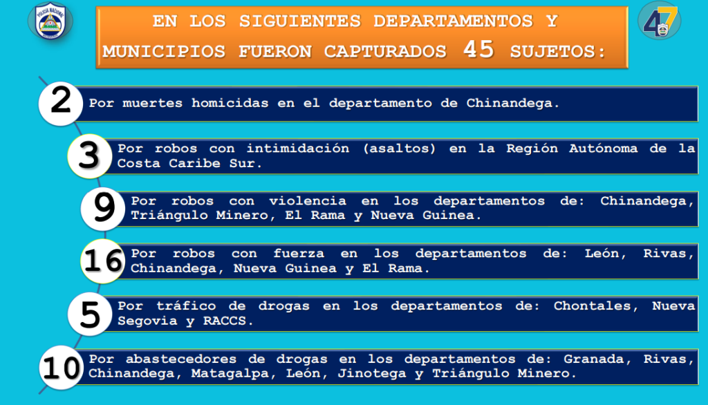 Además, de cinco por tráfico de drogas en Chontales, Nueva Segovia y la Región Autónoma de la Costa Caribe Sur, tres por robos con intimidación (asaltos) en la Región Autónoma de la Costa Caribe Sur y dos por muertes homicidas en Chinandega.
