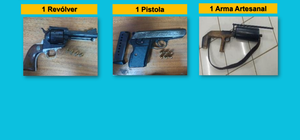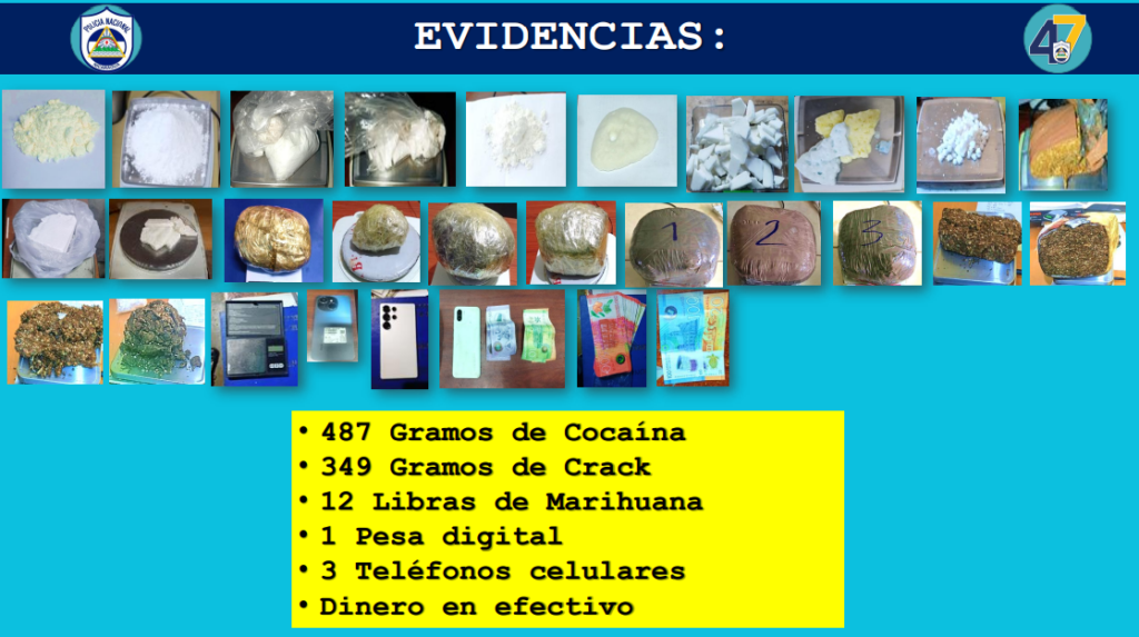 Entre las evidencias, la policía incautó 487 gramos de cocaína, 349 gramos de crack, 12 libras de marihuana, una pesa digital, tres teléfonos y dinero en efectivo, además ocupó un revólver, una pistola y un arma artesanal.