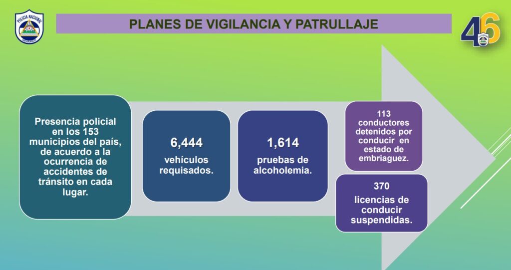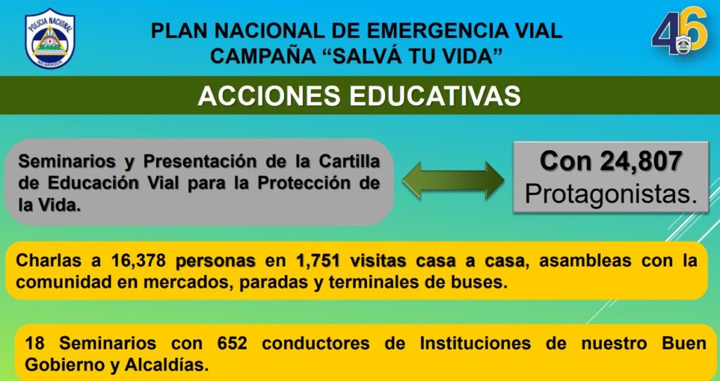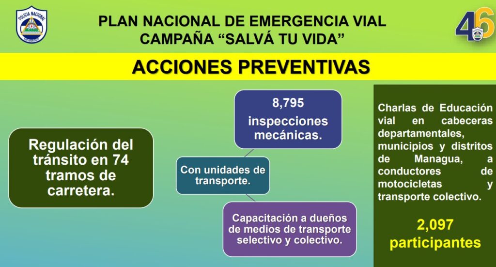 “Dentro de las acciones preventivas se brindó regulación del tránsito en 74 tramos de carretera. Con unidades de transporte se realizaron 8 mil 795 inspecciones mecánicas y se brindó capacitación a dueños de medio de transporte selectivo y colectivo. Se realizaron charlas de educación vial en cabeceras departamentales, municipio y distritos de Managua a conductores de motocicletas y transporte colectivo, con un total de 2 mil 97 protagonistas”, destacó.