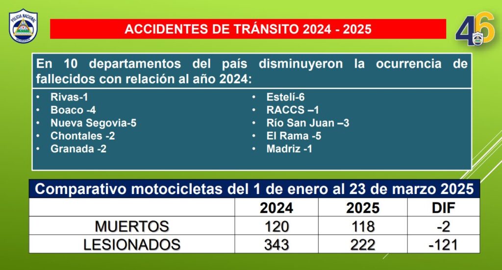 En su informe semanal, la Cojefa de Relaciones Públicas de la institución del orden público, subcomisionada Karen Obando, destacó que en 10 departamentos del país, disminuyó la ocurrencia de muertos en accidentes de tránsito en relación al año pasado.
